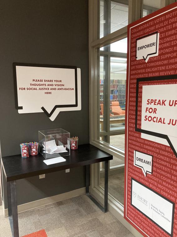 Speak Up for Social Justice is an interactive, physical exhibit which provides a platform for the library community to share their thoughts and vision about working toward social justice and anti-racism. Writing and drawing supplies are provided, and contributions of all genres—statements, poems, drawings, collages, and more -- are welcomed.