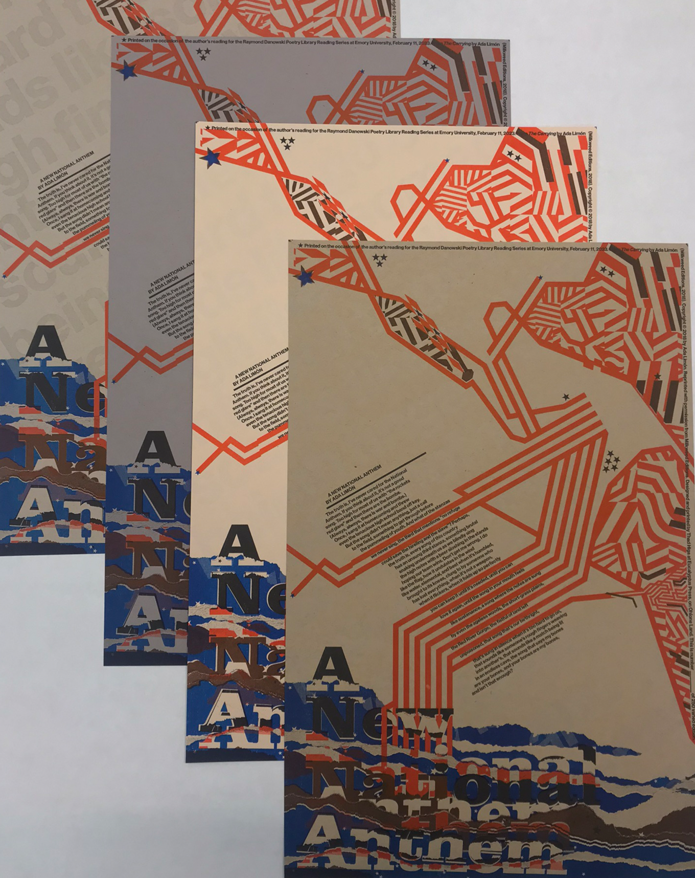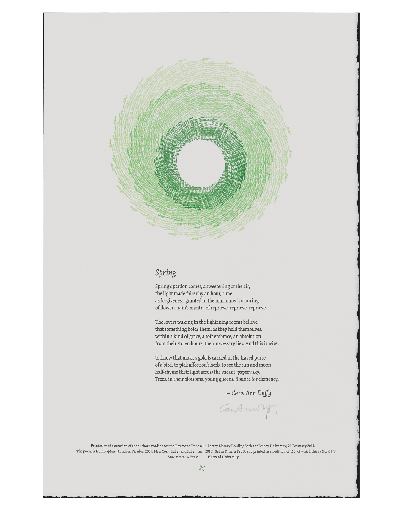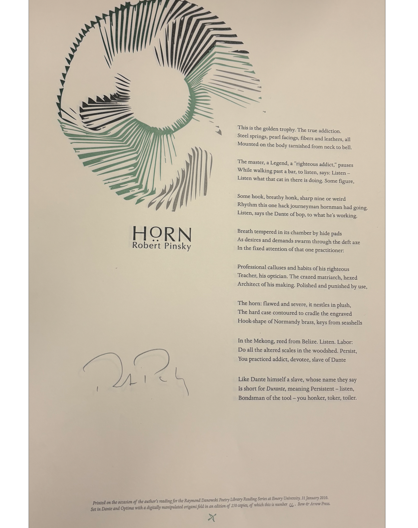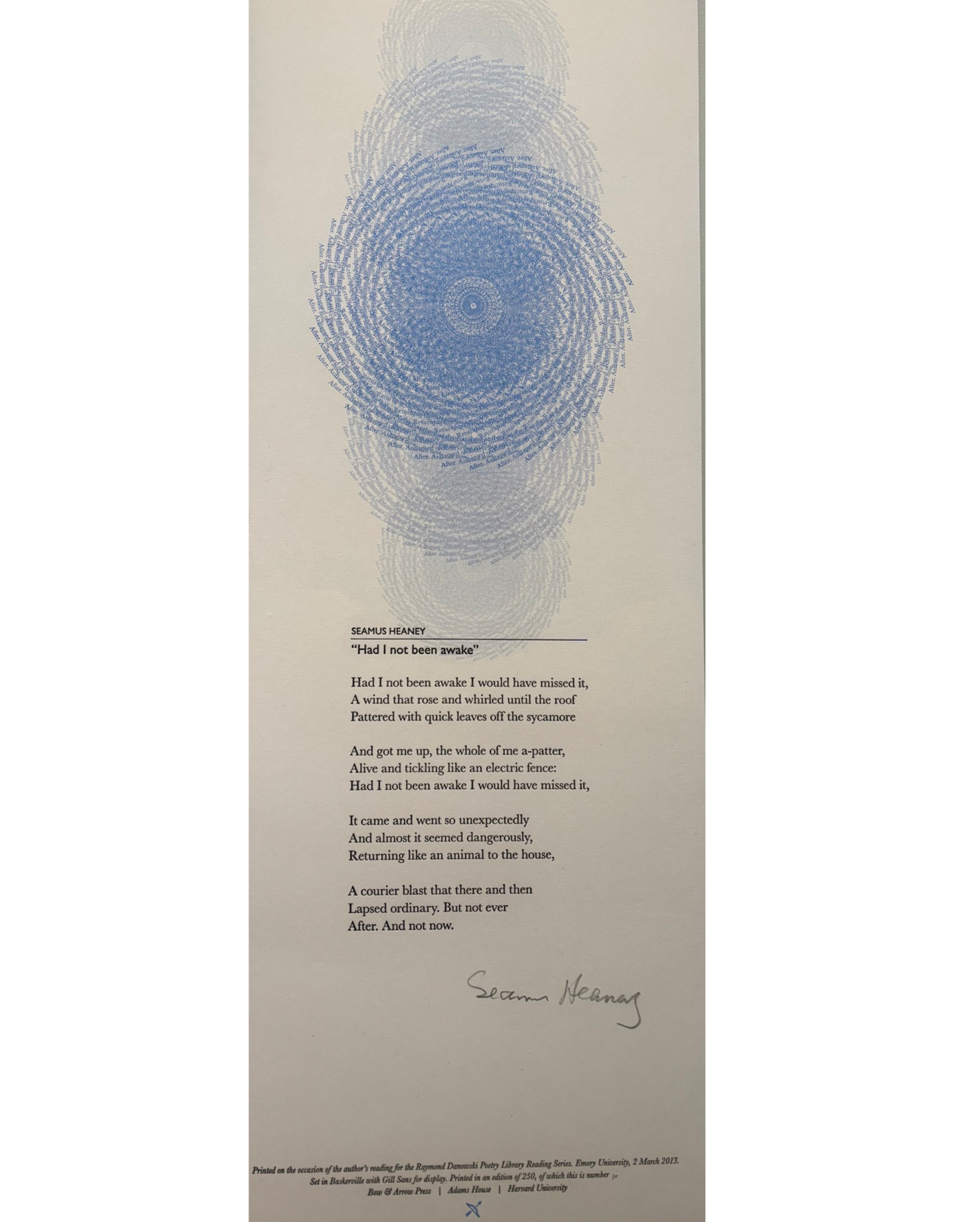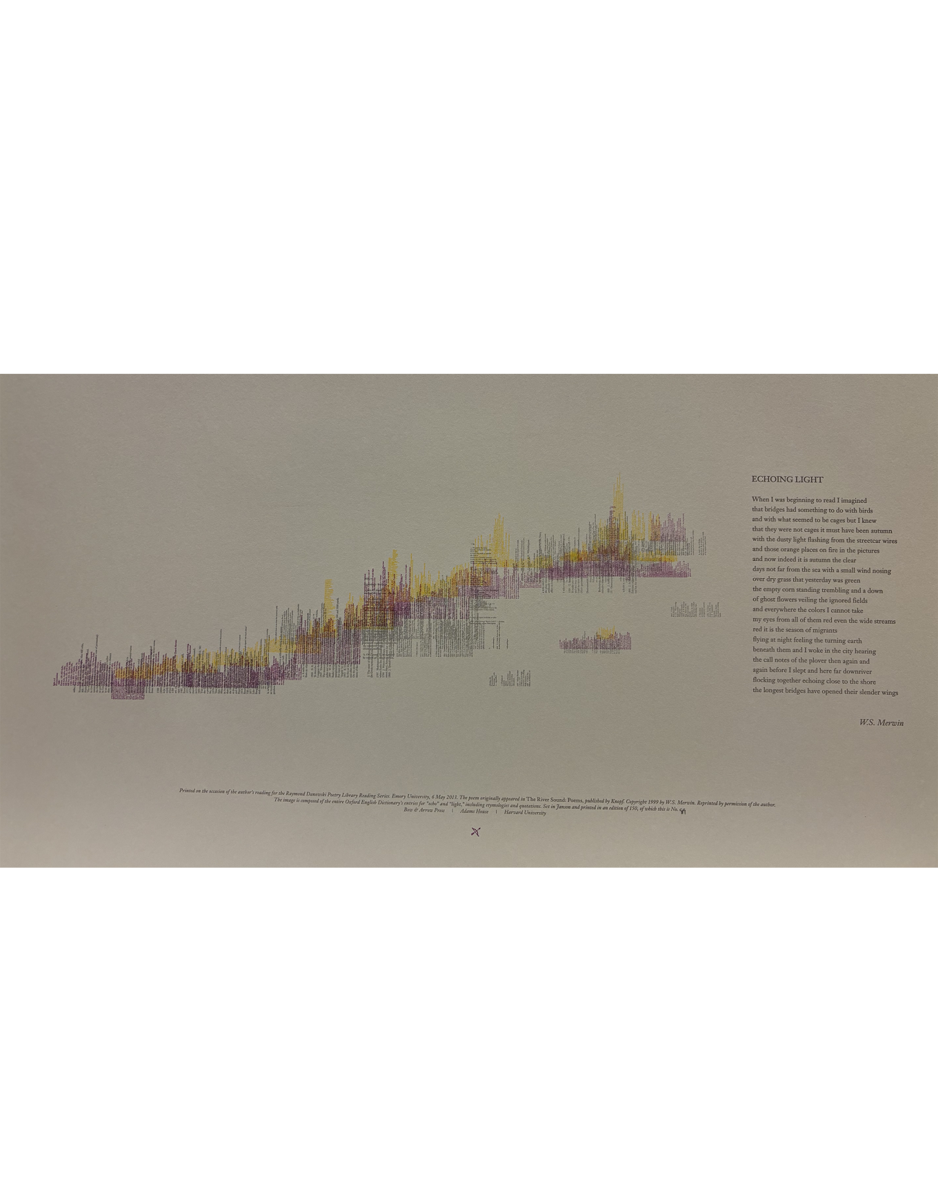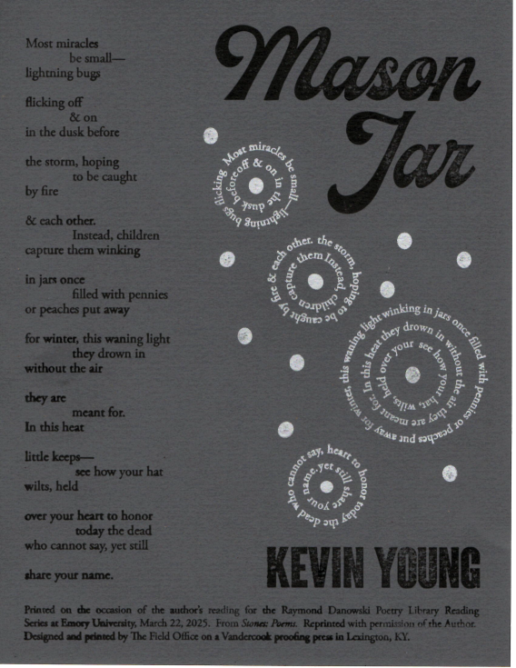 The Rose Library commemorates our Raymond Danowski Poetry Library Reading Series and other major events with broadsides designed and produced in limited editions. Broadsides are for sale for $50 each on a first come, first serve basis. Sales support the Rose Library's poetry collections and programming. To purchase a broadside please reach out to Erin Glogowski, Operations Program Coordinator, at eglogow@emory.edu.