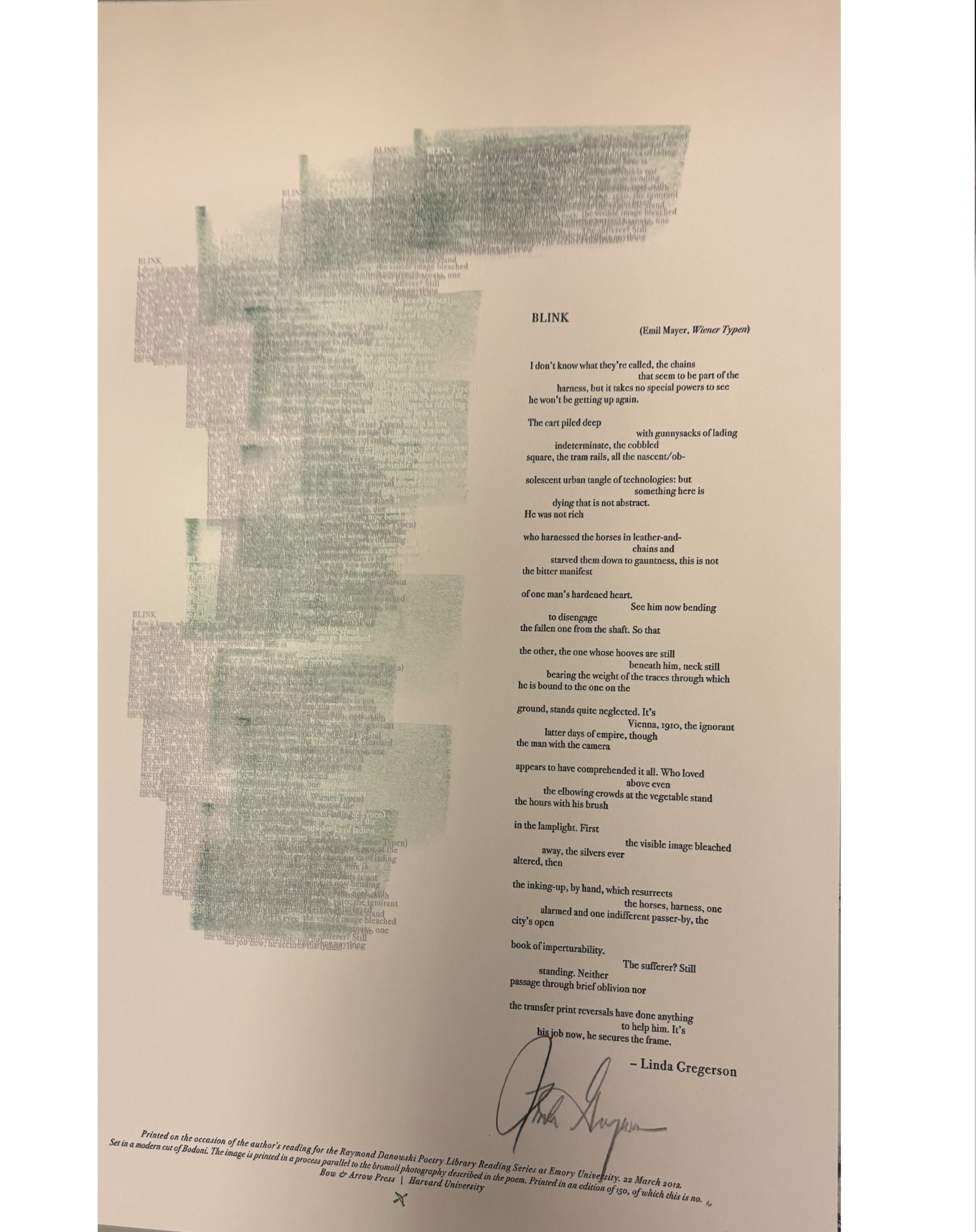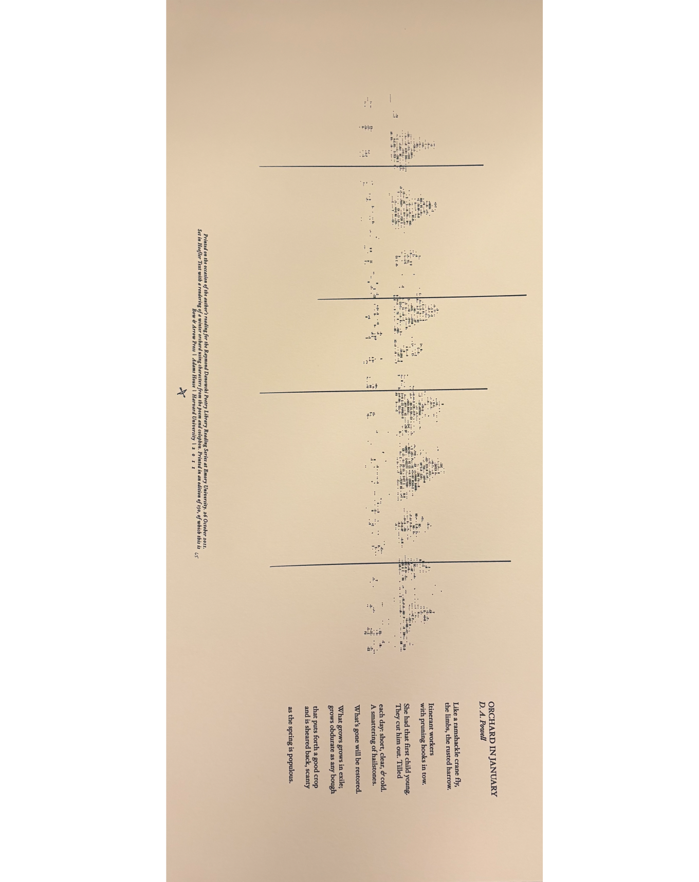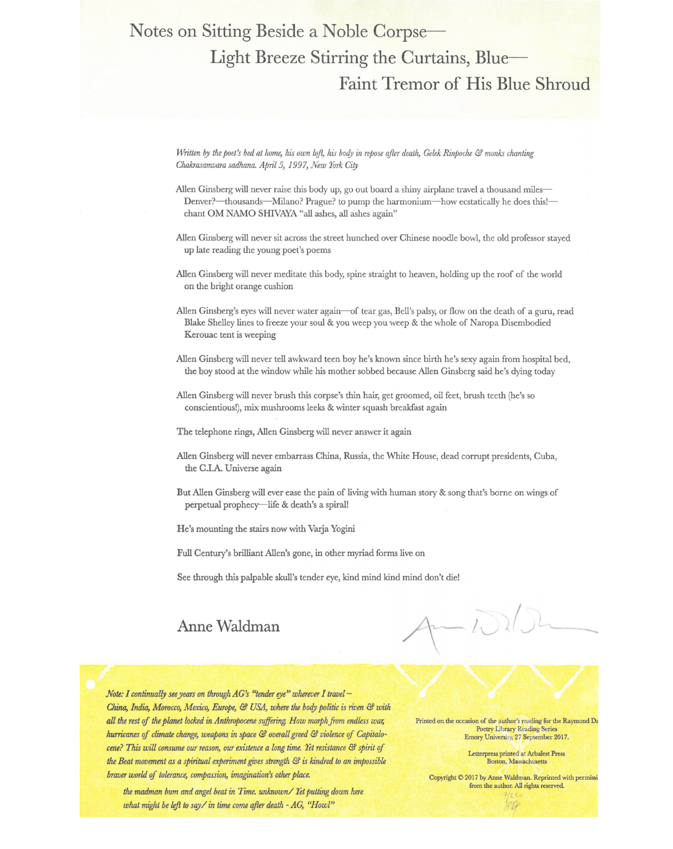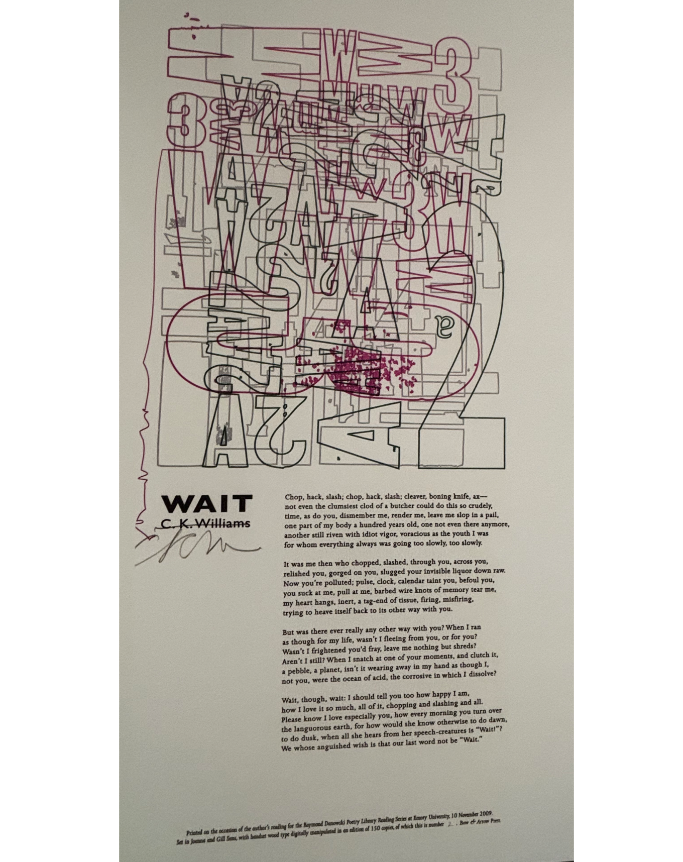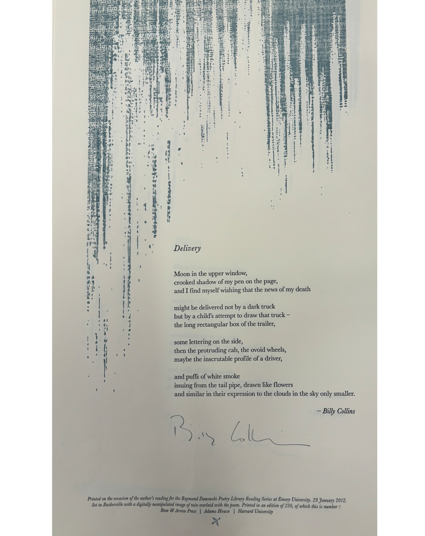 The Rose Library commemorates our Raymond Danowski Poetry Library Reading Series and other major events with broadsides designed and produced in limited editions. Broadsides are for sale for $50 each on a first come, first serve basis. Sales support the Rose Library's poetry collections and programming. To purchase a broadside please reach out to Erin Glogowski, Operations Program Coordinator, at eglogow@emory.edu.