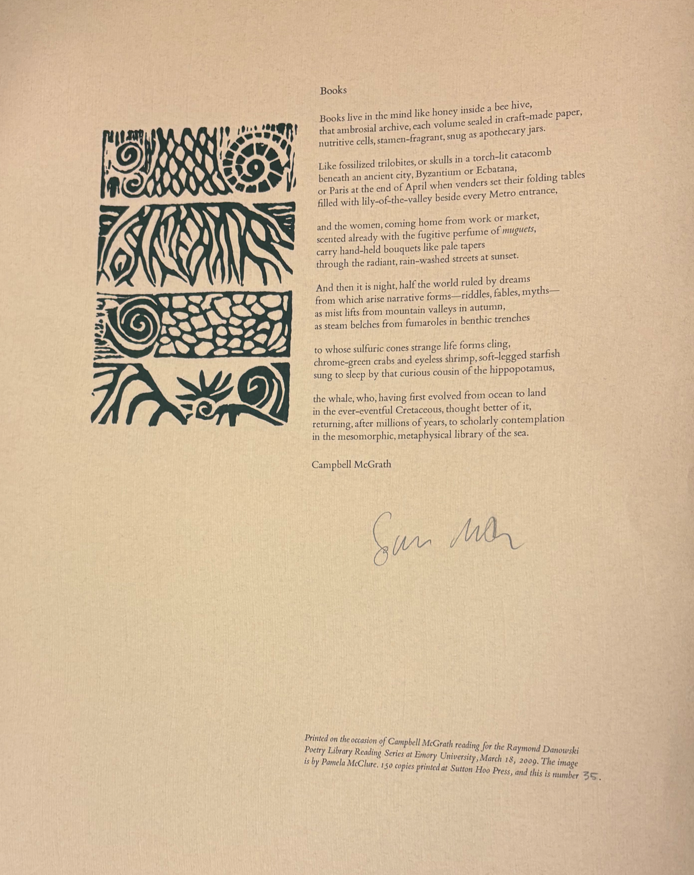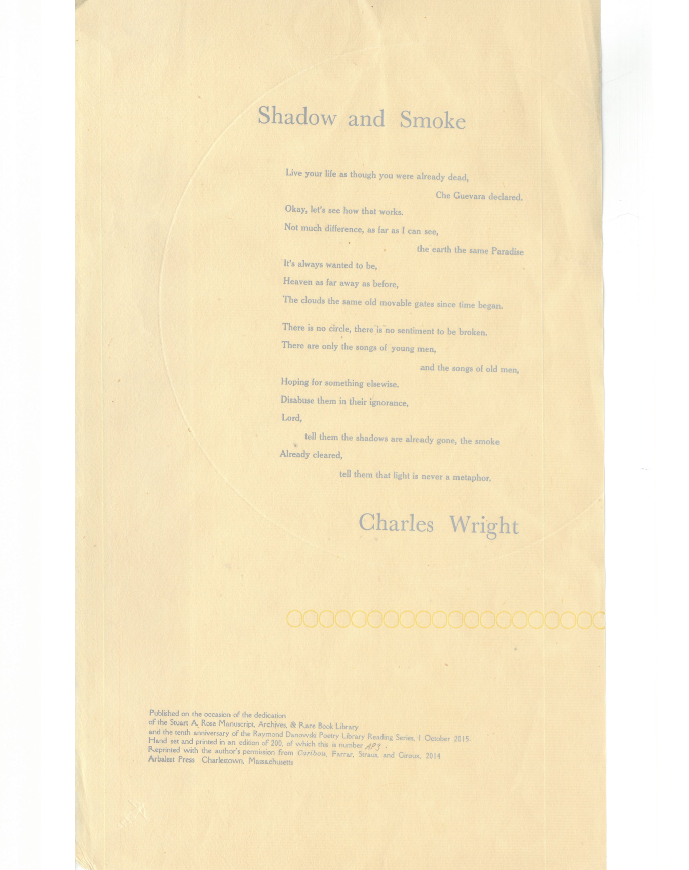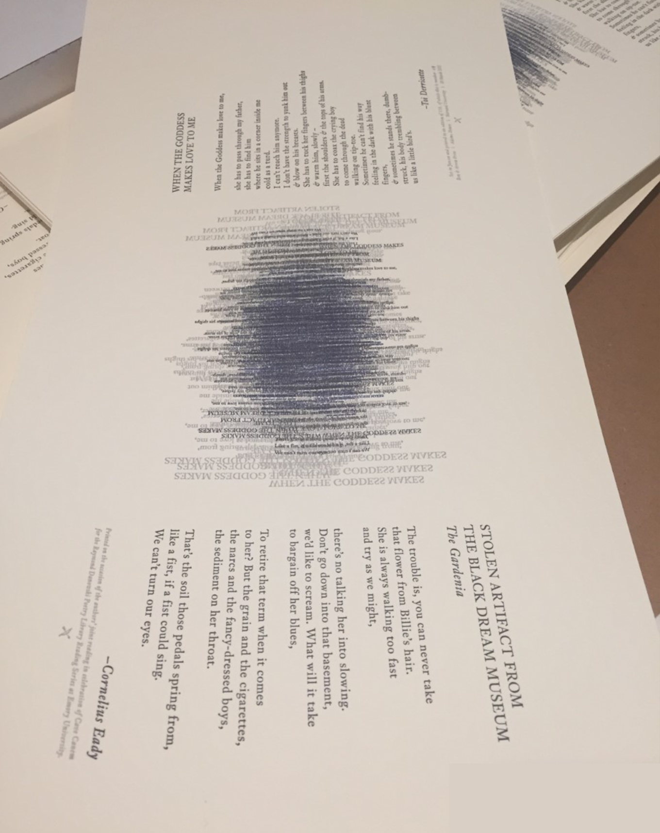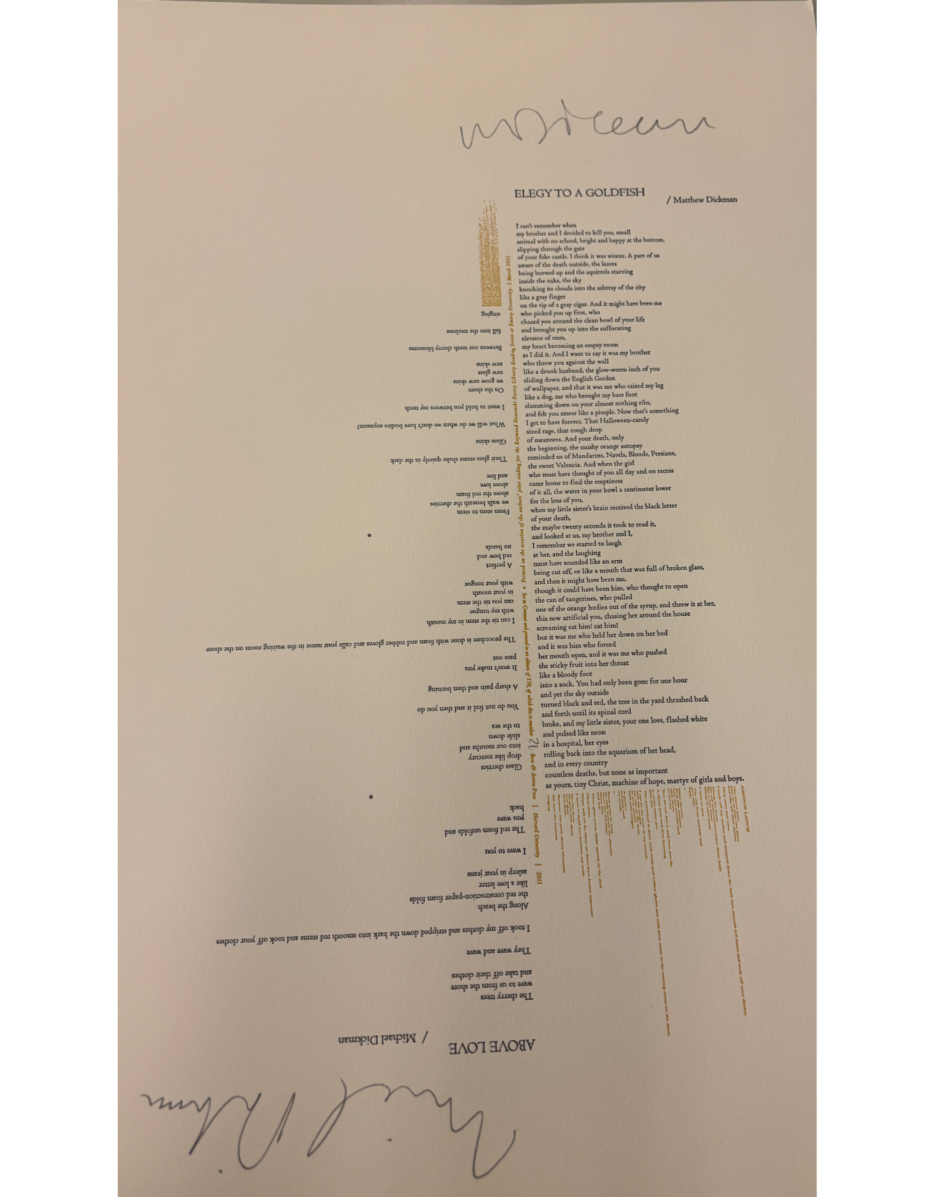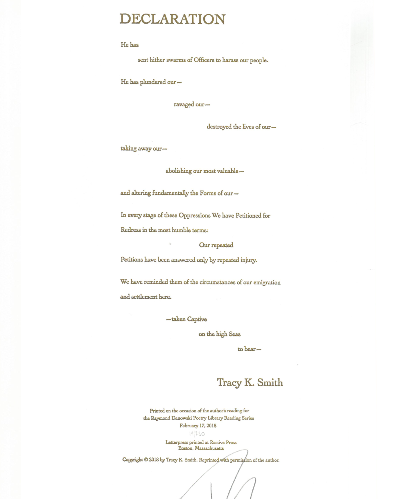 The Rose Library commemorates our Raymond Danowski Poetry Library Reading Series and other major events with broadsides designed and produced in limited editions. Broadsides are for sale for $50 each on a first come, first serve basis. Sales support the Rose Library's poetry collections and programming. To purchase a broadside please reach out to Erin Glogowski, Operations Program Coordinator, at eglogow@emory.edu.